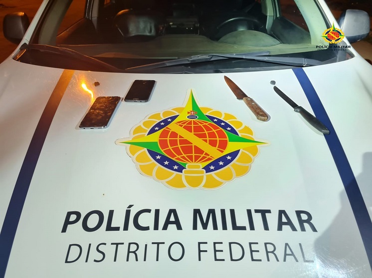 A equipe intensificou o patrulhamento em busca do indivíduo com tais características. Quando passava em frente a Unidade de Internação de Planaltina, avistou dois indivíduos, sendo que um deles tinha as mesmas características do indivíduo suspeito (blazer e calça jeans). Feita a abordagem nos dois indivíduos, de imediato foi localizado, nas vestes de ambos, duas facas e dois celulares (uma faca e um celular com cada um). Os indivíduos não souberam esclarecer a procedência dos celulares.