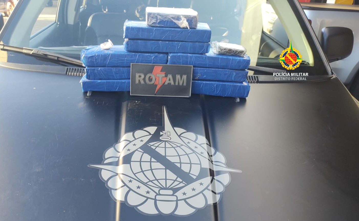 A equipe abordou os suspeitos e posteriormente revistou o carro em que eles estavam. No assoalho do veículo os policias encontraram uma caixa com oito tabletes de maconha, totalizando 8,5 kg e mais 100 gramas de haxixe na porta do motorista.