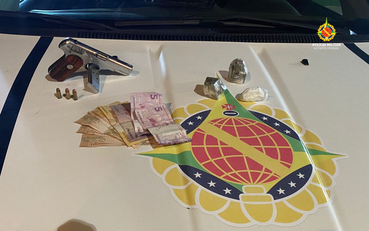 Ao abordá-lo, foi encontrado dentro de três porções de maconha, uma porção de cocaína, 255,00 reais em dinheiro e uma pistola calibre 765 com três cartuchos de munição.