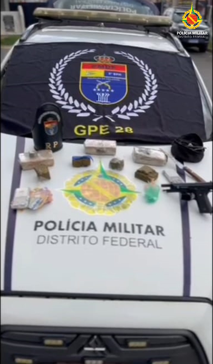 Os Policiais Militares do Distrito Federal do 8º Batalhão prenderam homem com 7 peças de maconha, 2 porções de Cocaína, 2 balanças de precisão, faca e um simulacro de arma PT 92 e R$ 105,80 reais em dinheiro.