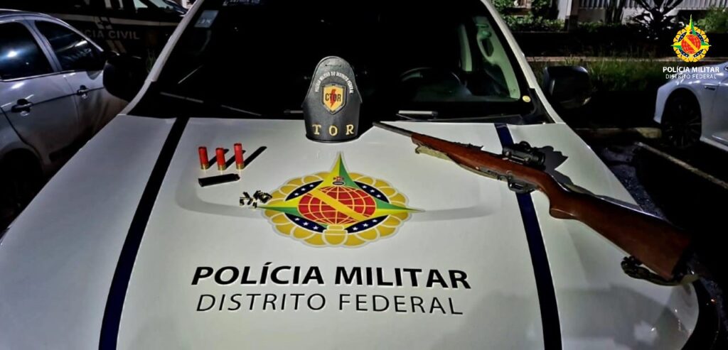 Policiais militares do Tático Operacional Rodoviário (TOR) abordaram um Fiat/Uno em um ponto de bloqueio na DF 130, KM 14, onde encontraram uma carabina calibre 22 coberta por uma jaqueta camuflada e três munições calibre 12 gauge no bolso, além de um pote no banco dianteiro contendo 217 munições calibre 22.