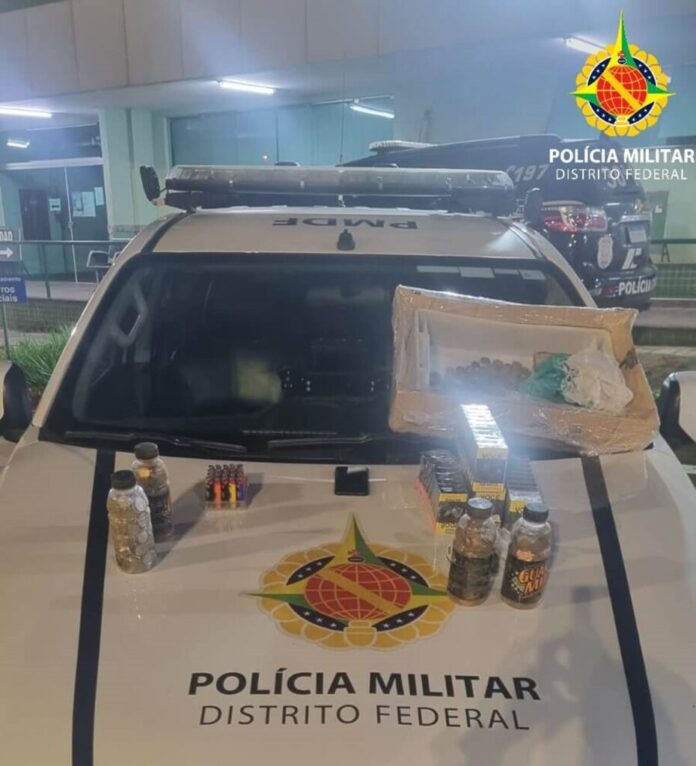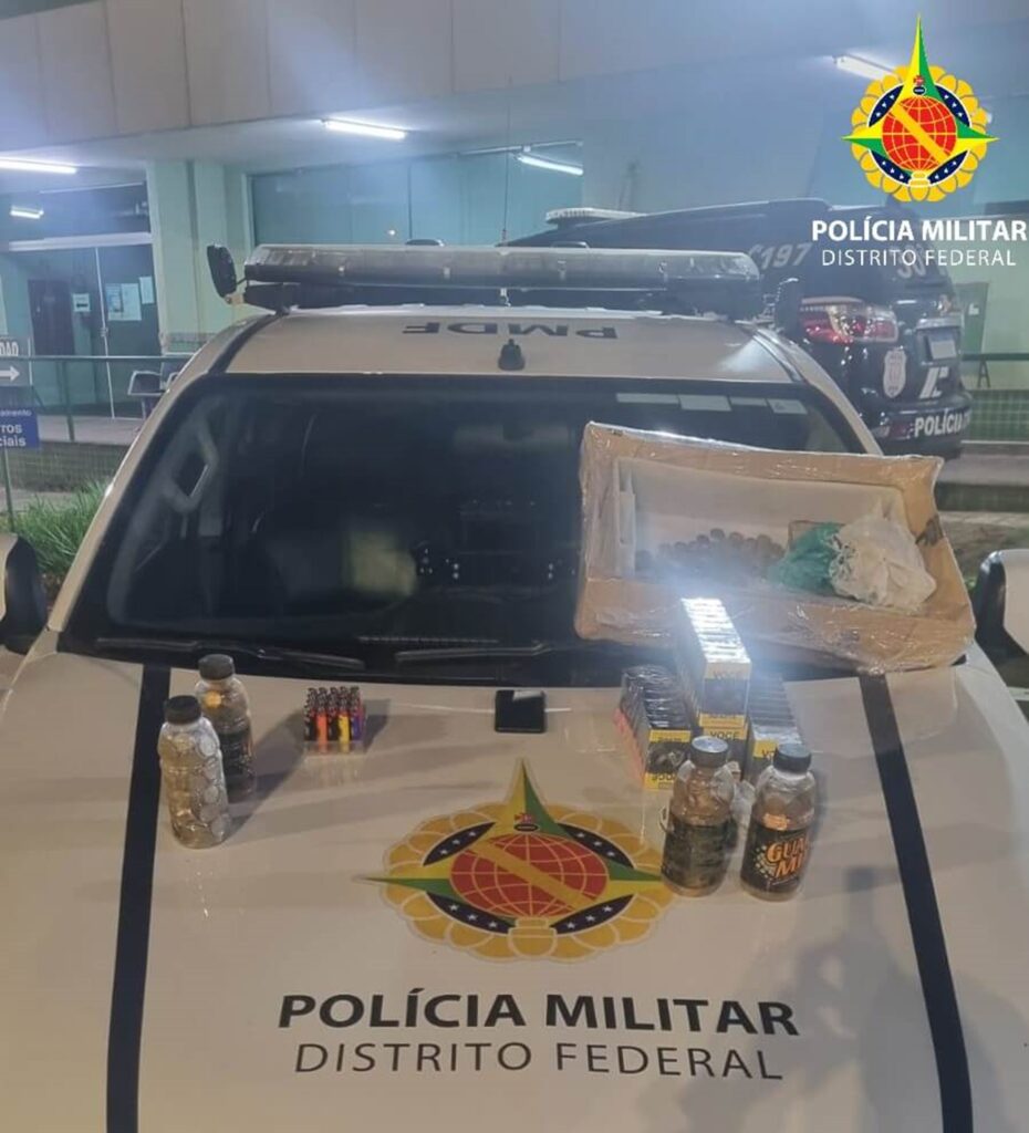 Então, os policiais realizaram a abordagem contataram que dentro da caixa, continha 38 carteiras de cigarro, 21 isqueiros, quatro garrafas cheias de moedas, sacolas com moedas, totalizando setecentos e oito reais.