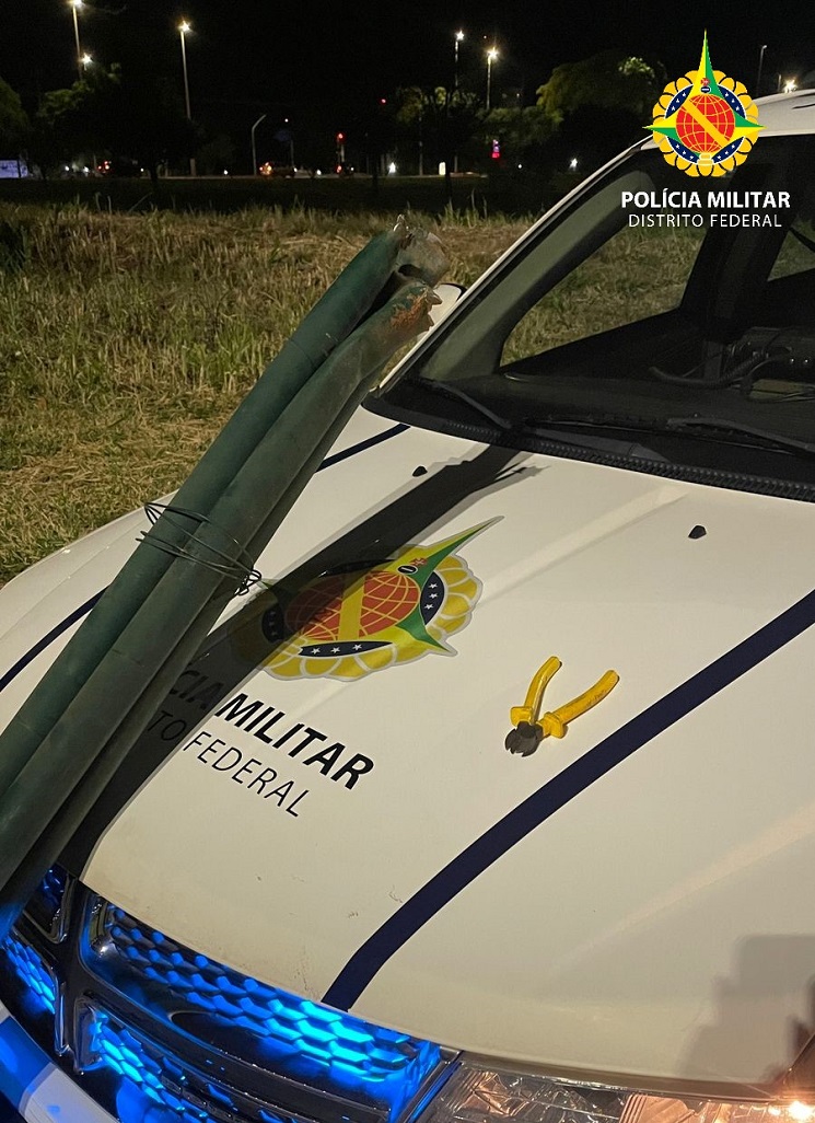 Os policiais do 17º Batalhão, realizavam patrulhamento quando visualizaram dois indivíduos, no interior do Taguaparque, transportando nas costas, algo que pareciam ser barras de ferro.