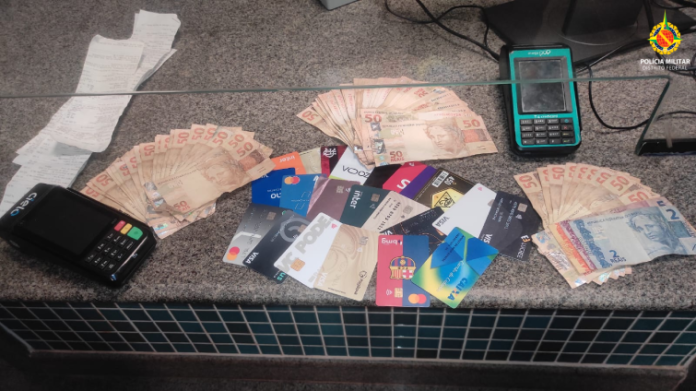 A equipe do Grupo Tático Operacional (GTOp34) realizava o patrulhamento tático na região, quando foram acionados por populares para verificar uma possível situação  de estelionatários agindo em um banco na Quadra 04. No local os policias abordaram os três suspeitos que não souberam explicar a origem dos objetos e na entrevista cada um contou uma história diferente. Com eles foram encontrados R$ 4.377,00 reais em espécie, cinco aparelhos celulares, duas máquinas de cartão, diversos cartões magnéticos, e um dispositivo de aproximação de cartão, usado para clonagem de cartões. Eles estavam também de posse de veículo Renault Fluence.