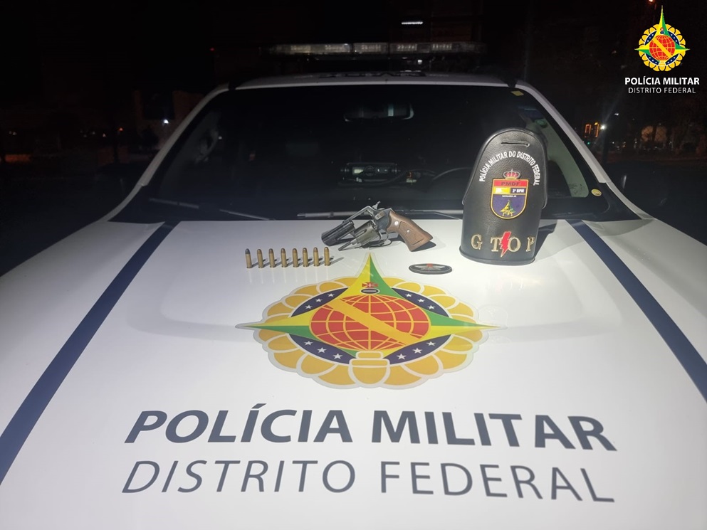 Na via Eixo Norte, altura da 209N, deram a ordem de parada e realizaram a abordagem. Com um dos indivíduos, foi encontrada uma arma de fogo, um revólver calibre .38, com a numeração suprimida, e oito cartuchos de munição intactos.