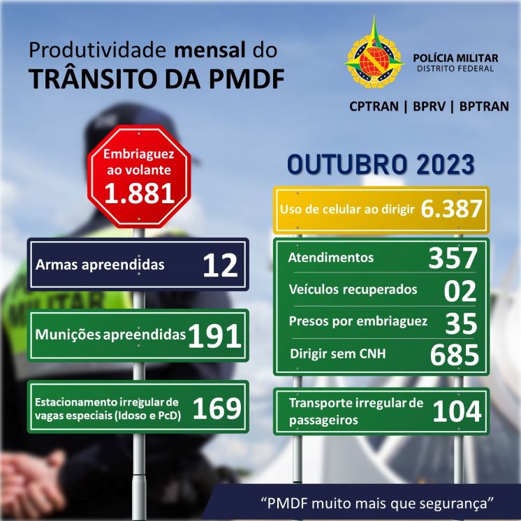 A Polícia Militar do Distrito Federal (PMDF), através do Comando de Policiamento de Trânsito (CPTRAN), envolvendo o Batalhão de Policiamento Rodoviário (BPR) e o Batalhão de Policiamento de Trânsito (BPTRAN), demonstrou, novamente, alta produtividade em suas operações, em toda a região, durante o mês de outubro.
