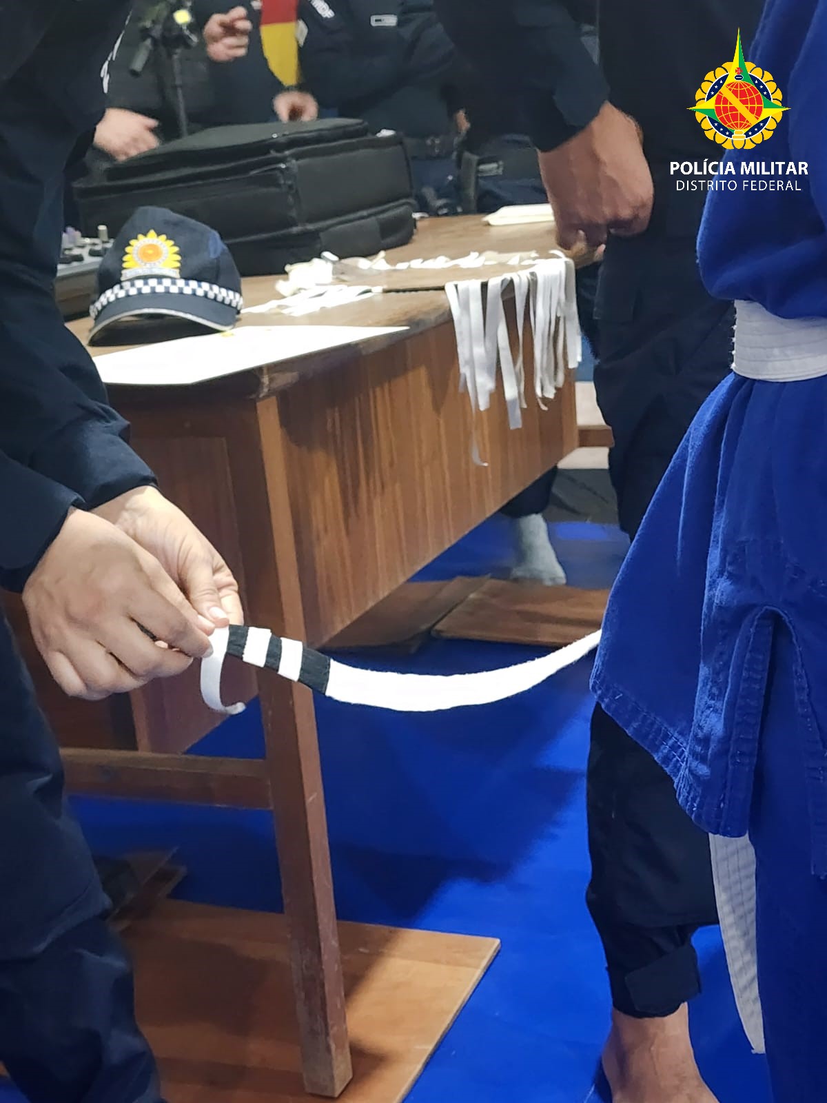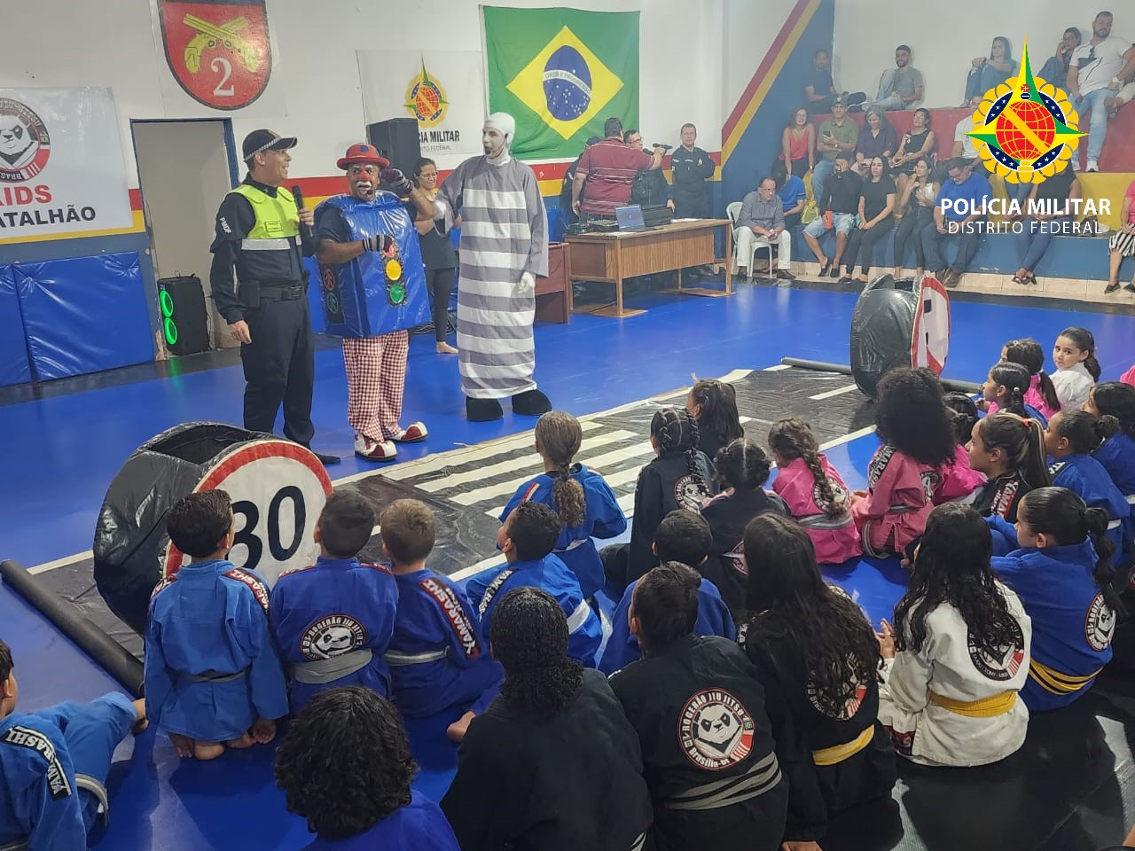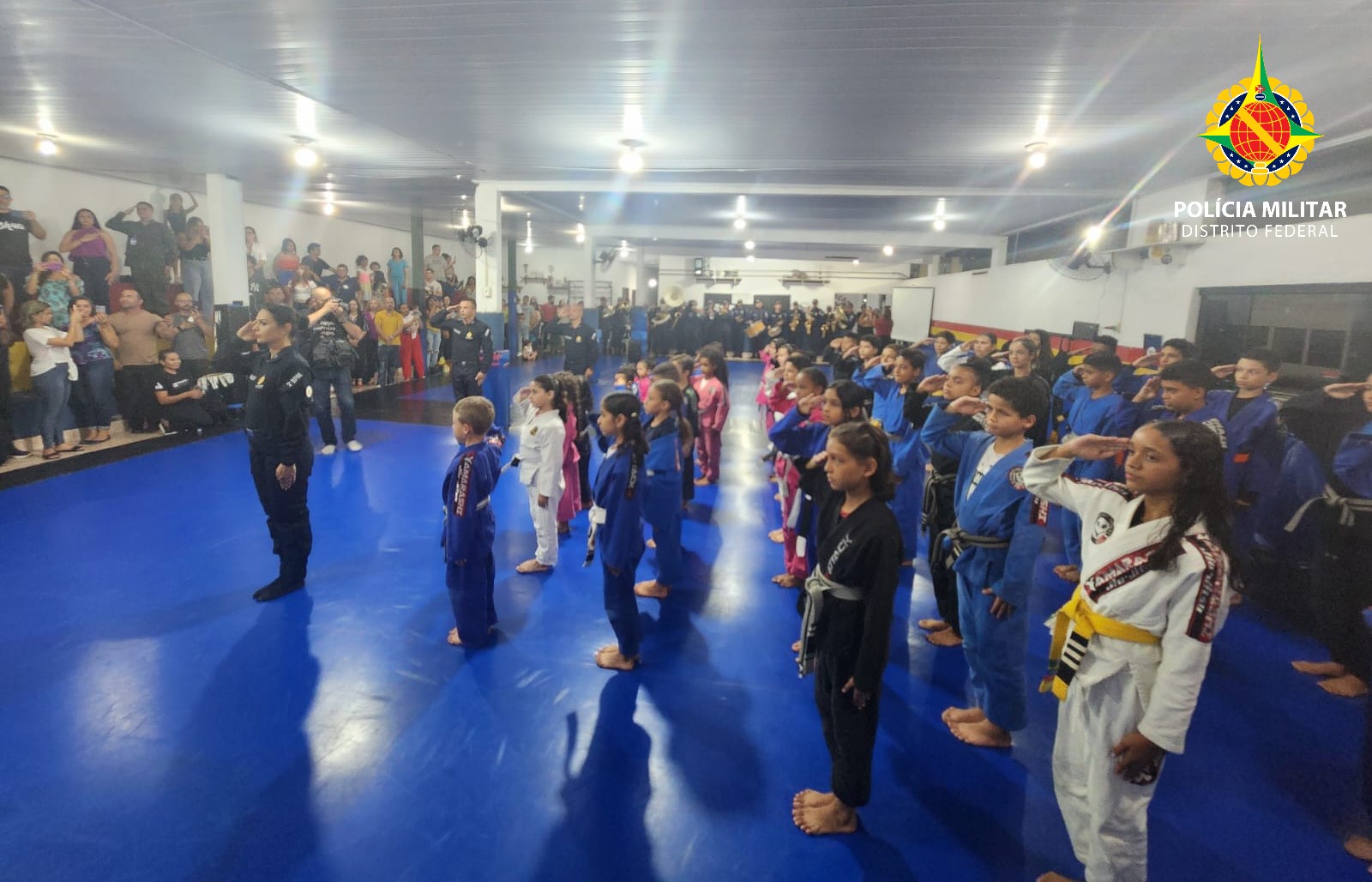 Posteriormente, as crianças demonstraram disciplina e respeito ao entrarem no tatame, exibindo conhecimentos de ordem unida. Acompanhadas pela banda da PMDF, entoaram o hino nacional integralmente, proporcionando um momento cívico emocionante para todos os presentes.