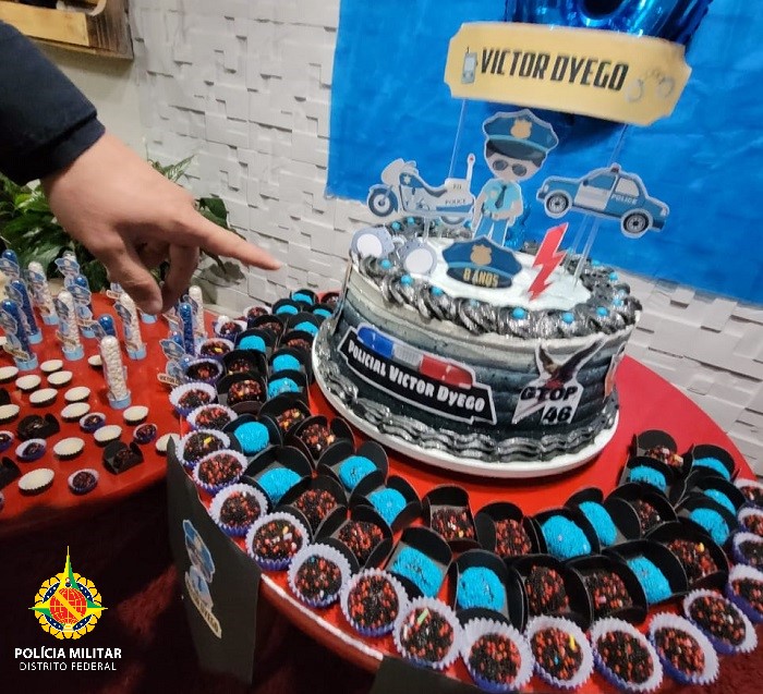 O aniversariante e toda sua família receberam a equipe com muita alegria. Para a surpresa dos policiais, o tema da festa era da Polícia Militar e o bolo enfeitado com Grupo Tático Operacional.