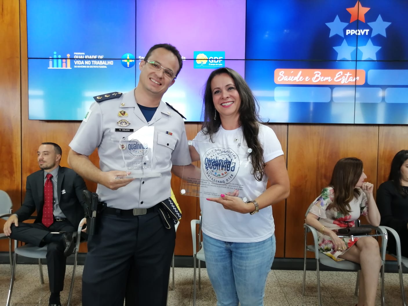 O Capelão Evangélico da PMDF, tenente-coronel Gisleno Gomes de Farias Alves, representou a corporação na solenidade. Ele recebeu o selo Qualivida das mãos da Secretária Executiva de Qualidade de Vida (Sequali), Adriana de Faria.