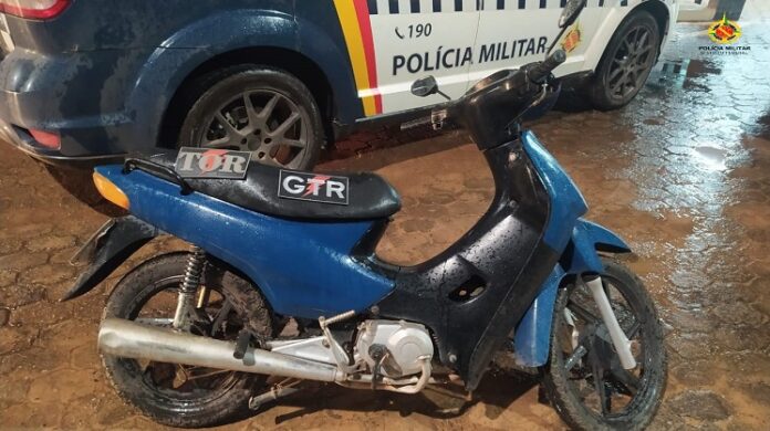 Na busca pessoal foi encontrada uma porção de maconha com o condutor. Durante a identificação veicular, foi verificado que a motocicleta constava no sistema como produto de furto/roubo.