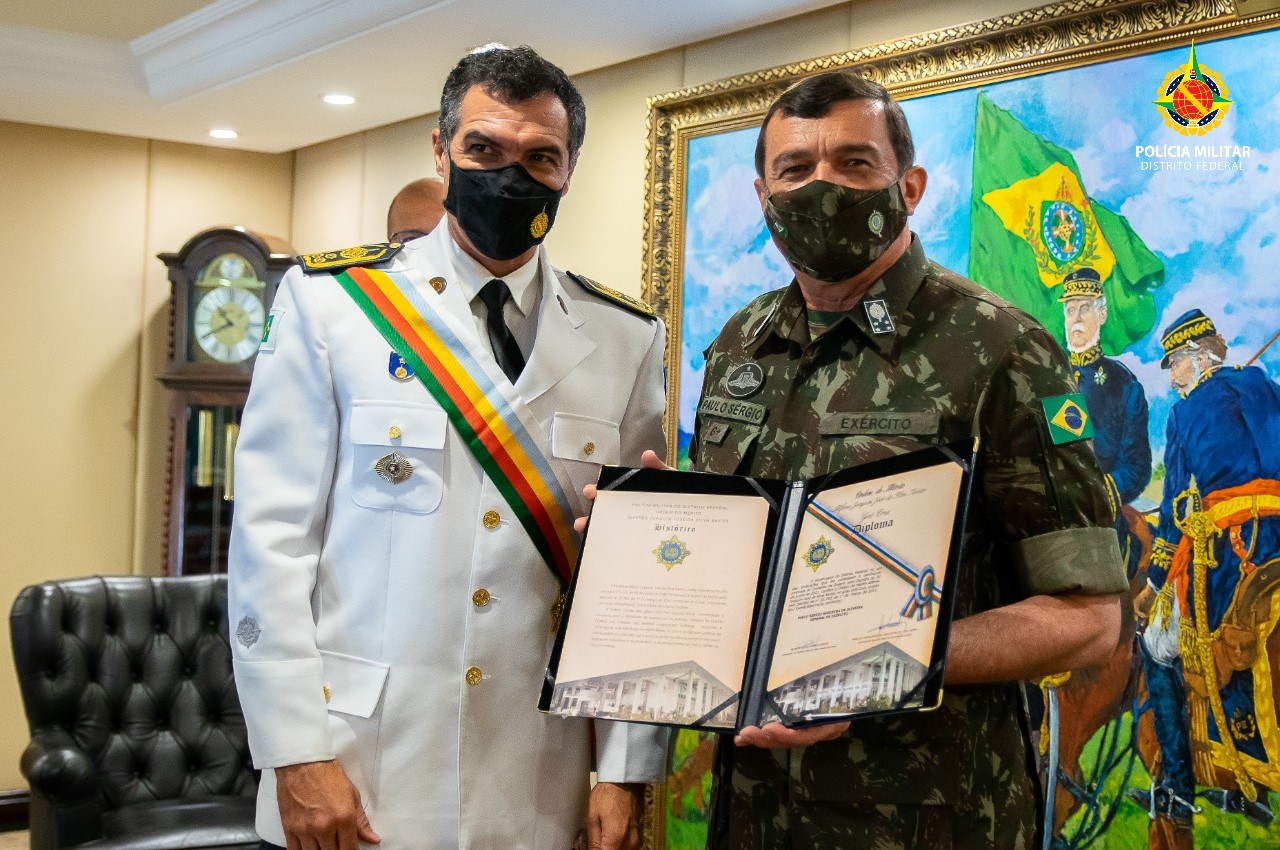 O comandante-geral da Polícia Militar, coronel Márcio Cavalcante de Vasconcelos condecorou o comandante do Exército, general Paulo Sérgio Nogueira de Oliveira, com a Medalha Tiradentes. A entrega da medalha ocorreu na manhã desta terça-feira (25), no gabinete do comandante, no Estado Maior do Exército.