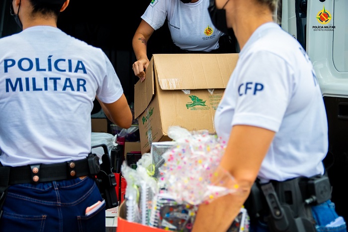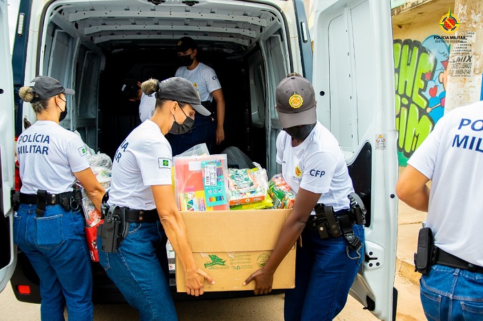 Logo em seguida, os policiais foram em outros lugares da Estrutural fazer a entrega das cestas básicas e dos materiais escolares.