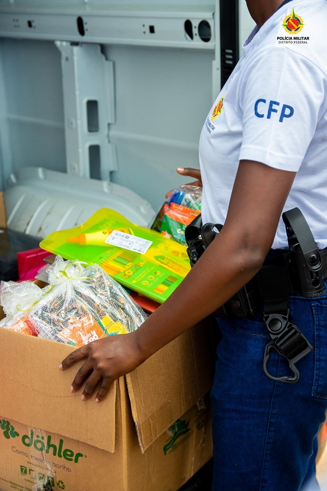 Antigo comandante do 15º Batalhão, unidade responsável pelo policiamento na região, o major Arantes recebeu um pedido de uma liderança comunitária para doação de material escolar. Ele passou a demanda para Comissão de Ação Social do CFP VIII que fez a arrecadação do material junto aos alunos do Curso de Formação de Praças. A comissão, formada pelas soldados 2ª Classe Tatiane Guerra, Clarisse Bredow e Karollynne, conseguiram arrecadar mais de 400 kits de materiais escolar. Os alunos também fizeram a doação de cestas básicas, totalizando 68 cestas para serem entregues a comunidade da Estrutural. Somente a aluna do CFP Larissa Badú, doou 50 cestas.