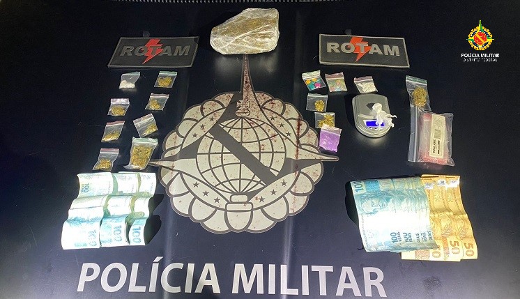A equipe da Rotam apreendeu 295g de skunk, em barra, nove porções menores da mesma droga, 20 comprimidos de ecstasy, sete porções de cocaína, uma balança de precisão e R$ 2 mil, em espécie. A droga estava guardada dentro do guarda-roupas.