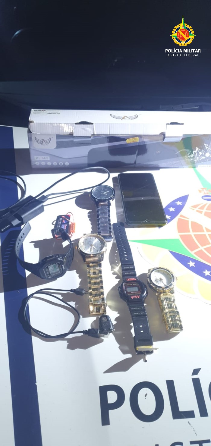 Foi realizada ronda nas proximidades e foram localizados dois homens na posse de 05 relógios, um aparelho de som, um celular e um carregador de celular.
