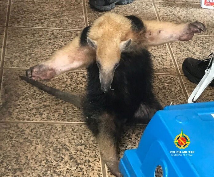 Policiais militares integrantes do Batalhão de Polícia Militar Ambiental foram acionados para resgatar um tamanduá-mirim, por volta das 14h nesta segunda-feira (07), em uma residência na QI 19 do Lago Sul.