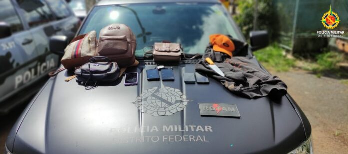 O veículo com os dois suspeitos foi seguido até a QNG 44, onde foi abordado. Um deles tentou fugir correndo, mas foi detido na área de chácaras do lado oposto da rodovia. Dentro do carro estava a faca usada no roubo e os pertences das vítimas.