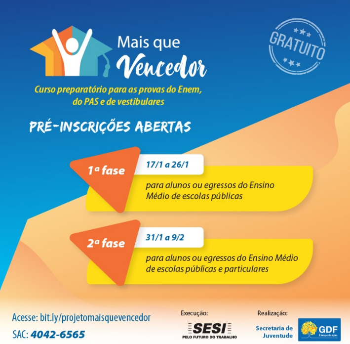 A Secretaria de Estado e da Juventude do DF em parceria com o Serviço Social da Indústria do DF – Sesi, realizará o projeto “Mais que Vencedor”. O objetivo da iniciativa é preparar candidatos para as provas de acesso ao ensino superior (vestibulares, Enem e PAS).