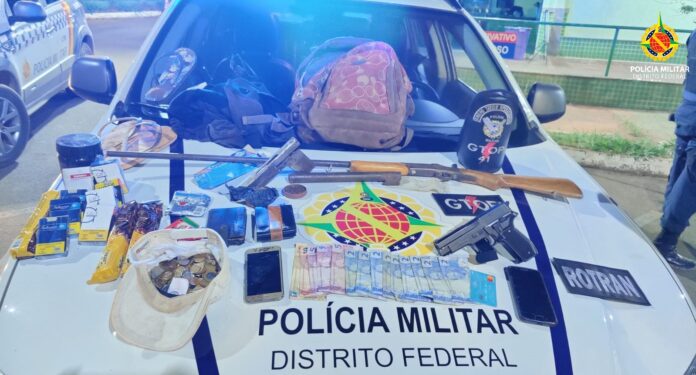 O suspeito afirmou que a arma usada no assalto era um simulacro e o Gtop 41 foi até a casa indicada por ele, onde estavam mais dois suspeitos. Os policiais localizaram na residência outros objetos roubados, um simulacro de pistola, uma espingarda calibre 36 desmuniciada e uma arma tipo garrucha artesanal.