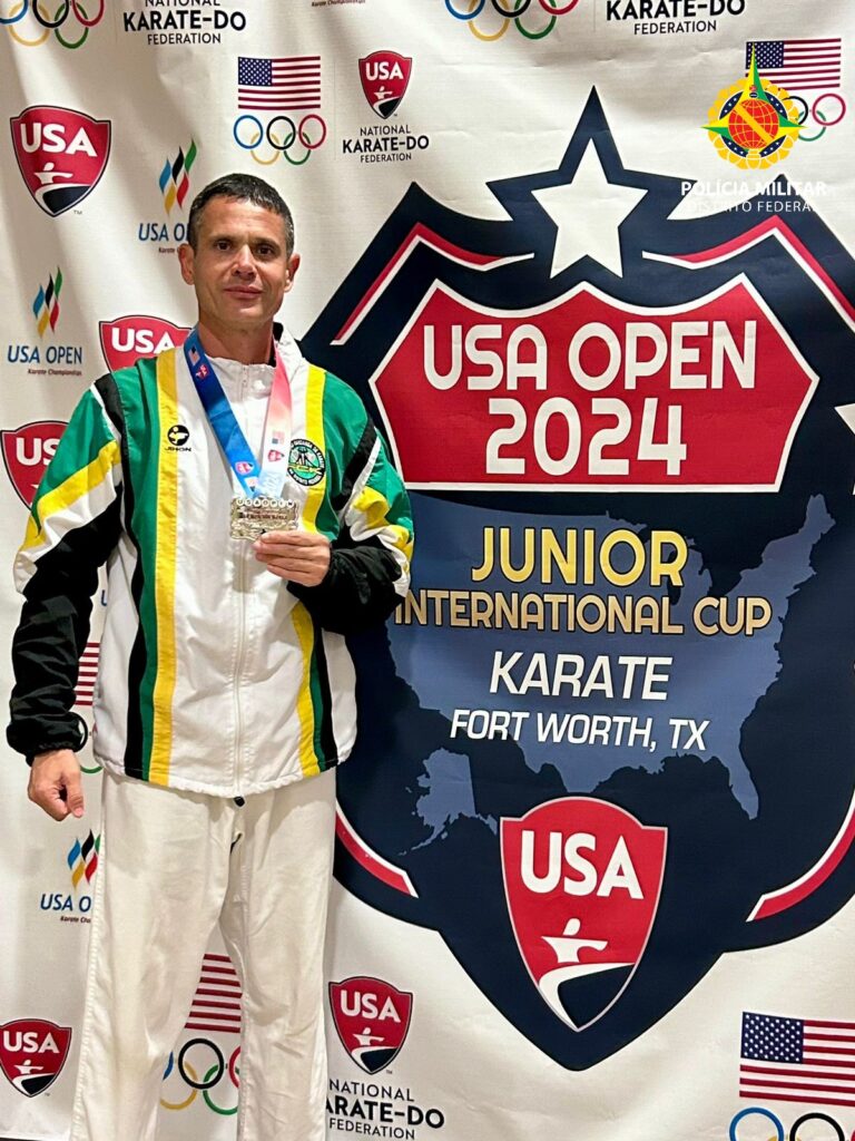 O 2º sargento Adriano Justino de Souza conquistou a medalha de prata na edição de 2024 do USA Open Karate Championships. O torneio foi realizado em Fort Worth, no Texas EUA, neste sábado (30). O policial lotado no Batalhão de Operações Especiais da PMDF (Bope) competiu na categoria Open, para atletas com mais de 35 anos.