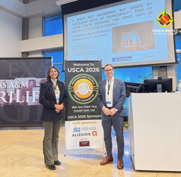 Representando a excelência técnica das forças de segurança locais, o trabalho científico intitulado “A Space Not Abandoned, but Struck by Successive Acts of Delinquency: Fear of Crime, Urban Disorder, and CPTED Gaps in Brasília’s Pedestrian Tunnels” foi apresentado pelo Major Leandro Barbosa de Lima (PMDF) e pela Agente de Polícia Juliana Teixeira (PCDF).