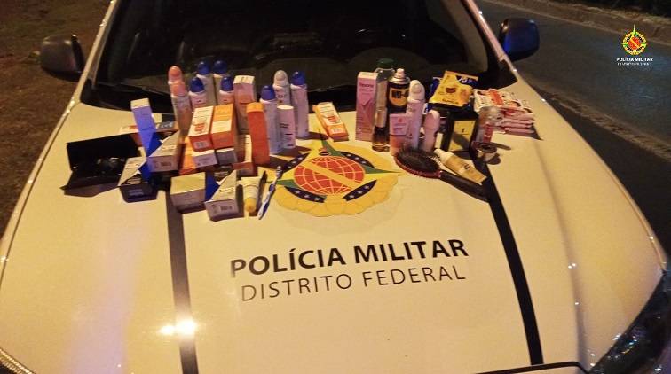 Durante todo o trajeto de fuga os suspeitos arremessaram pela janela do carro produtos oriundos dos furtos. Dentro do carro foram encontradas três sacolas com produtos diversos tais como protetor solar, barra de chocolate, cosméticos e perfumes.