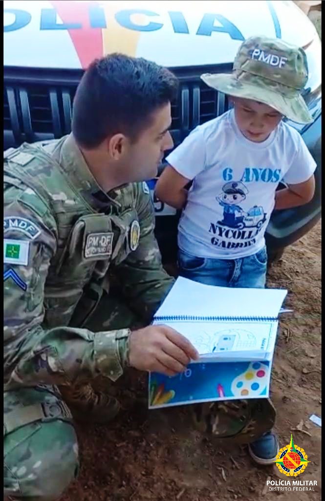 O aniversariante foi presenteado com Certificado “Amigo da PMDF, Guardião Mirim” e cadernos de pintura que retratam ações e o dia a dia do Policial Militar.
